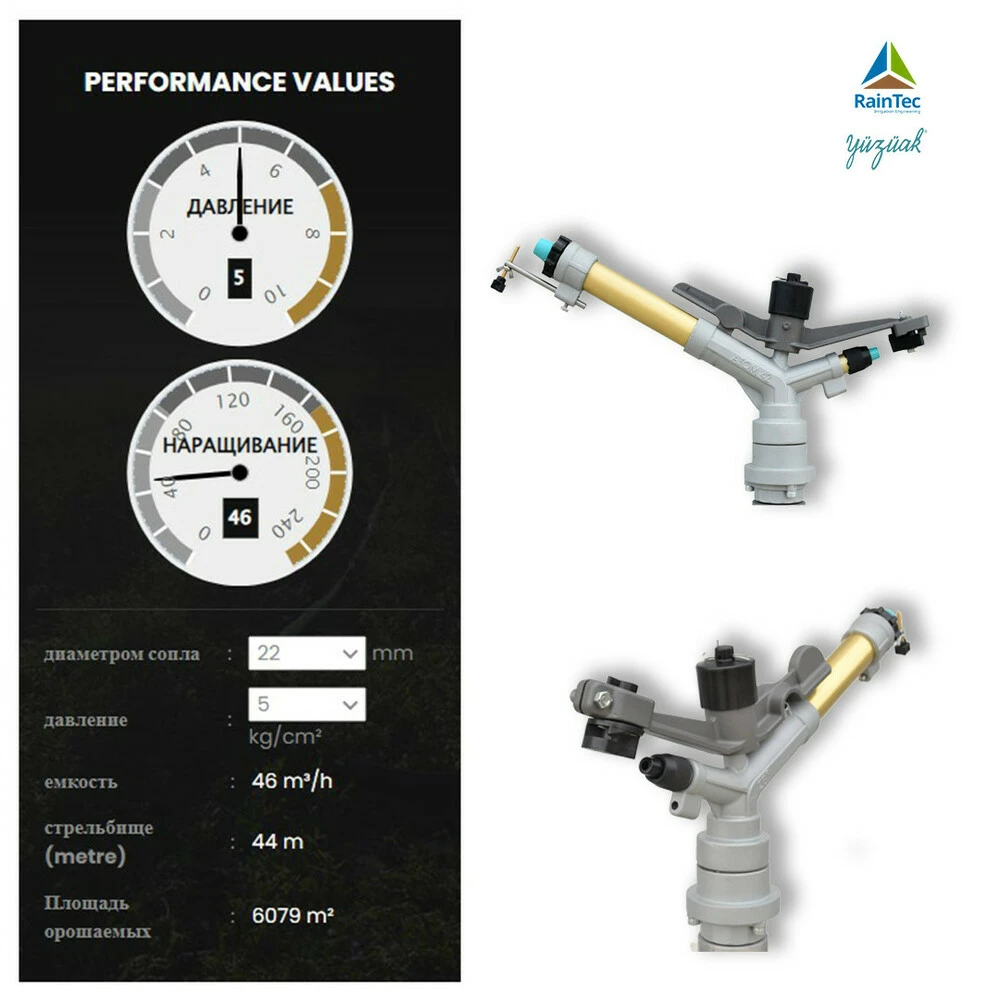 Разбрызгиватель ударного действия, вращающийся по кругу. Он имеет выпускное отверстие с двойным отверстием и сменную вращающуюся насадку. Он используется только для полного оборота. Это работает при среднем и высоком давлении (2 – 5 бар). Регулируемый водоотбойник обеспечивает равномерный полив. А благодаря углу наклона корпуса 28 градусов, он менее подвержен влиянию ветра по сравнению с его эквивалентами 30 и 33 градуса. Основной корпус алюминиевый с вращающимся механизмом. Нижние части корпуса из алюминия и латуни. Уплотнительная система латентного типа, без проблем работает с илистой водой.