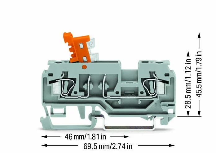 2-проводные клеммы с размыкателем Wago 280-870, тестовый клеммник; с отключением поворотного ножа; с тестовым портом; для DIN-рейки 35 х 15 и 35 х 7,5; 2,5 мм²; CAGE CLAMP®; 2,50 мм²; серый.