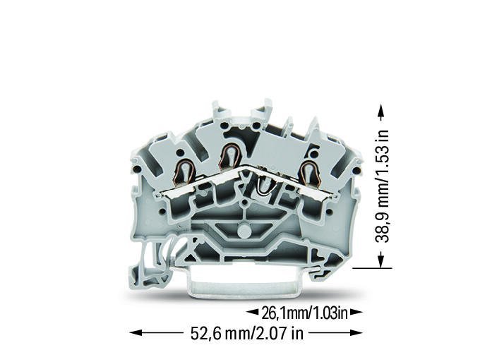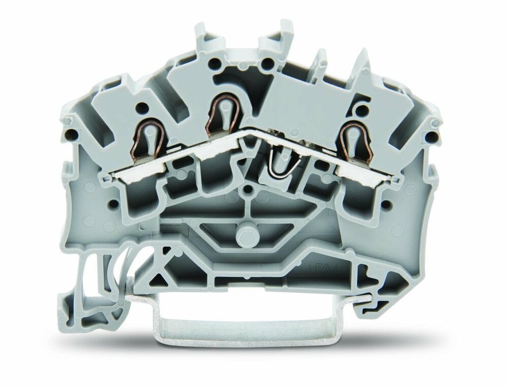 3-проводные проходные клеммы 2,5 мм² Wago 2002-6301, подходят для исполнений Ex e II; боковая и центральная маркировка; для DIN-рейки 35 x 15 и 35 x 7,5; Push-in CAGE CLAMP®; 2,50 mm²; серые.