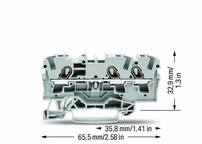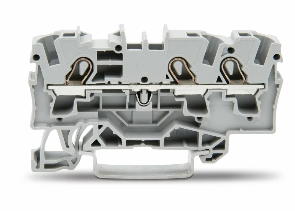 3-проводные проходные клеммы 4 мм² Wago 2004-1301, подходят для исполнений Ex e II; боковая и центральная маркировка; для DIN-рейки 35 x 15 и 35 x 7,5; Push-in CAGE CLAMP®; 4,00 mm²; серые.