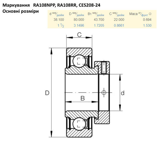 8050825 подшипник аналог RA108RR CES208-24 SNR (Франція), аналог 822-028C