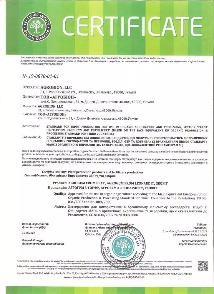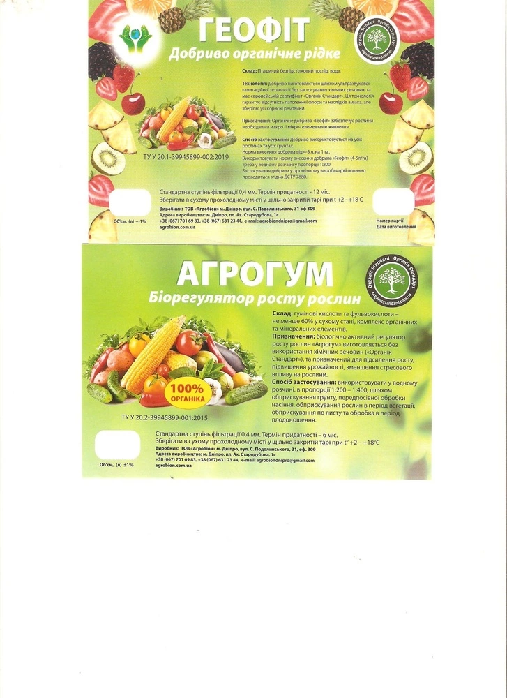Регулятор роста растений "Агрогум" производится из (органического) леонардита или торфа. Проходит обработку гидродинамическим ударом это первый этап , второй это обработка ультразвуком высокой частоты где распадаются молекулы на мельчайшие частисы для бысторго проникновения в растения. Регулятор роста хорошо зарекомендовал на пшенице,рапсе, кукурузе, а также на ягодных культурах и овощах как в открытом грунте так и теплицах. Применяется как для опрыскивания так капельного полива.