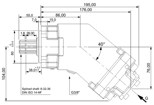 Нерегулируемый аксиально-поршневой насос с наклонным блоком Hidrocel 2PBA левого вращения (против часовой стрелки). Рабочий объем составляет 18 куб. см. Рассчитан на работу при номинальном давлении 350 бар и пиковом 400 бар. Шлицевой вал: 8-32-36 DIN ISO 14-NF.
