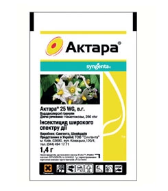Актара 25 WG в. г. — системний інсектицид нового покоління, має високу ефективність і швидко діє (протягом 15 хвилин) незалежно від погодних умов. Актара 25 WG в. г. гарантовано захищає рослини протягом 24 днів, що на 6–7 днів довше, ніж інші інсектициди. Актара 25 WG в. г. захищає також молоді пагони, які з’явилися після обробки, завдяки високій розчинності й рухливості діючої речовини в рослині. Діюча речовина препарату рухається по рослині тільки вгору (апікально) по ксилемі і не накопичується в бульбах, овочах та плодах, які формуються з відливом пластичних мас по флоемі. Препарат належить до класу малотоксичних речовин (ЛД50>5000 мг/кг).