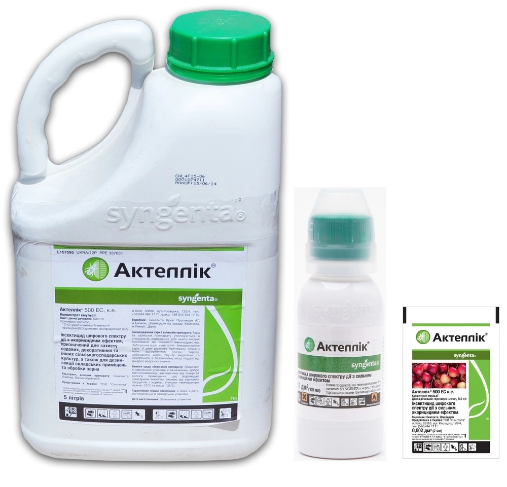 АКТЕЛЛІК® 500 ЕС - несистемний фосфорорганічний інсектицид з акарицидним ефектом, контактно-шлункової дії, призначений для захисту садових, декоративних та інших сільськогосподарських культур відкритого та закритого ґрунту від комплексу листогризучих та сисних шкідників, в тому числі кліщів.