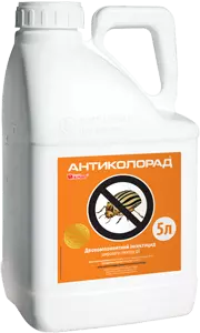 Максимальна кількість обробок— 2. Строк від останньої обробки до збирання врожаю – 20 днів. Норма витрати робочого розчину —200 - 400 л/га. Для приготування робочого розчину бак обприскувача заливають водою на 1/3 частину об’єму, вмикають режим змішування і додають необхідну кількість препарату. Доливають бак обприскувача до повного об’єму при ввімкненому режимі змішування. Під час внесення препарату режим змішування повинен бути постійно включений з метою підтримки робочого розчину в однорідному стані. Рекомендується застосовувати АНТИКОЛОРАД в період масового відкладання яєць старими жуками, не очікуючи появи личинок першого покоління. Обробку проводять з використанням наземної апаратури, рівномірно покриваючи листки та стебли рослин розчином. Обприскування в період вегетації культури. Якісне застосування інсектициду, своєчасність проведення захисних заходів, висока технологіч-ність внесення, сприятливі погодні умови підвищують ефективність дії препарату. Токсичність. Класифікація ВООЗ: ІІІ клас (малотоксичний). Термін виходу людей для проведення механізованих робіт – 3 доби, для ручних – 7 діб. • Унікальна препаративна форма, яка робить препарат більш ефективним в порівнянні з іншими інсектицидами; • інсектицид широкого спектру дії; • універсальний у використанні (контактна та системна дія); • дія препарату спостерігається відразу після обробки; • висока розчинність; • відсутність фітотоксичності для культури; • сумісний з багатьма засобами захисту рослин. Упаковка. 5 л.