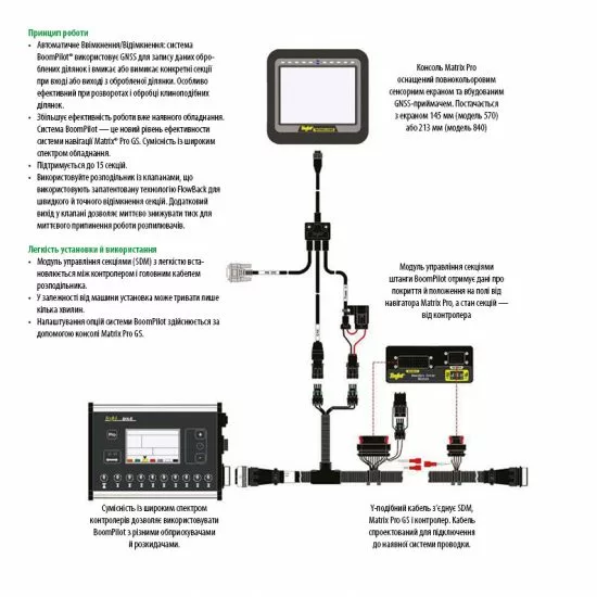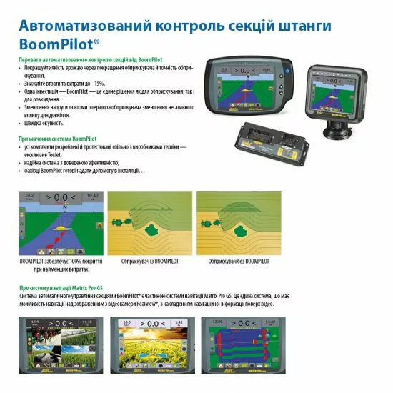• Увеличивает эффективность работы уже имеющегося оборудования. Система BoomPilot - это новый уровень эффективности системы навигации Matrix® Pro GS. Совместимость с широким спектром оборудования.