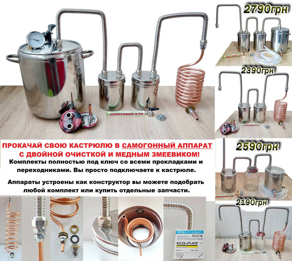 На фото представлены, лишь несколько вариантов комплектации дистилляторов. Благодаря единому стандарту 1/2 дюйма Вы можете подобрать свой индивидуальный комплект.