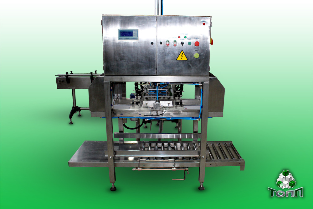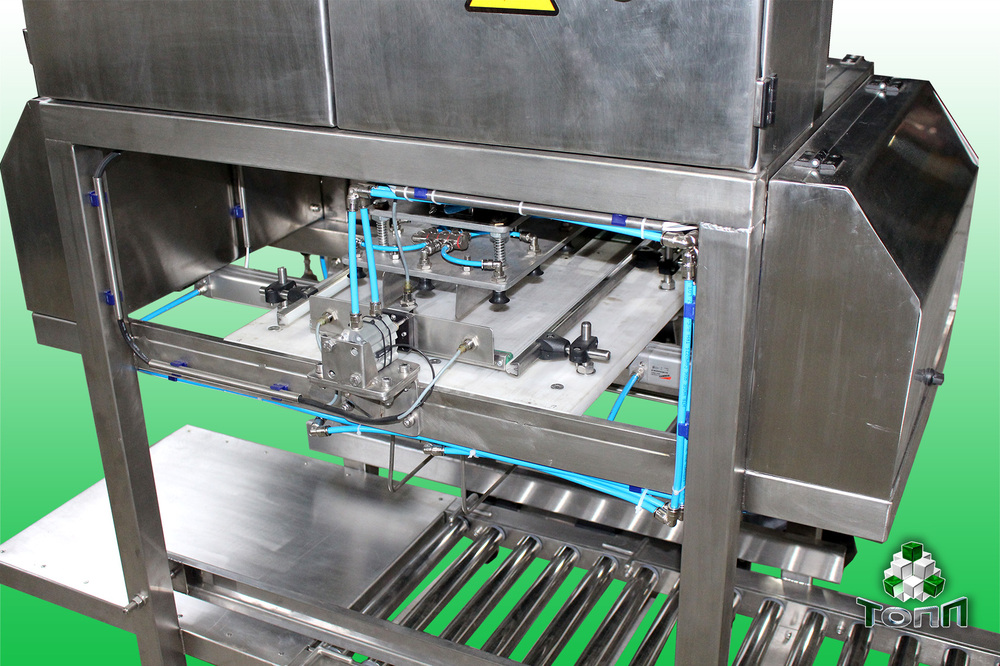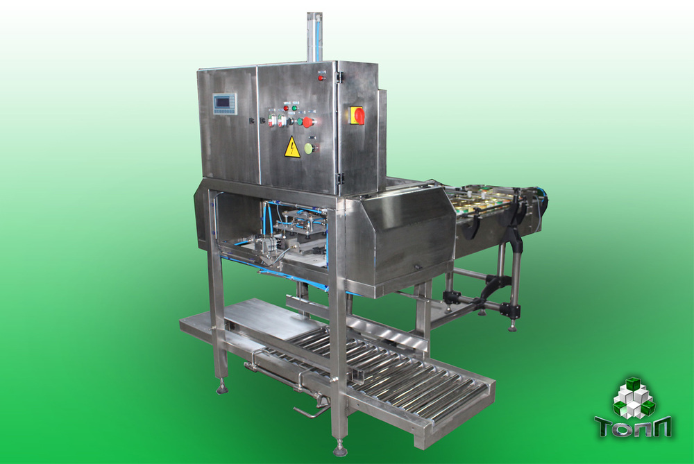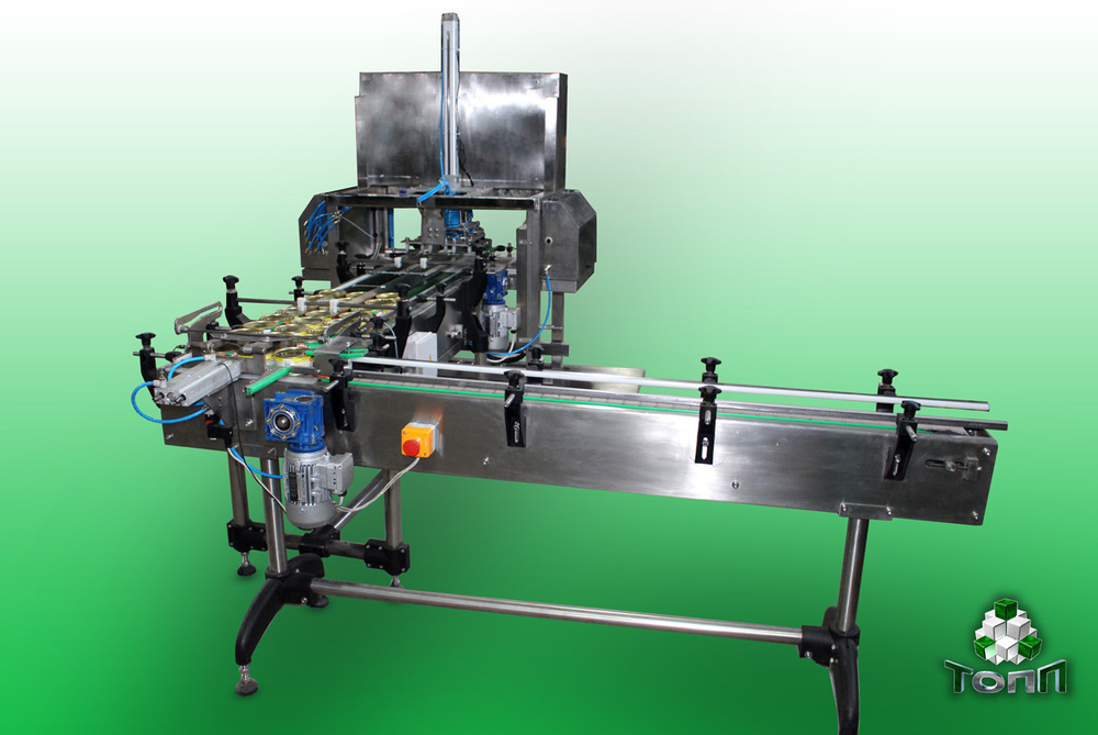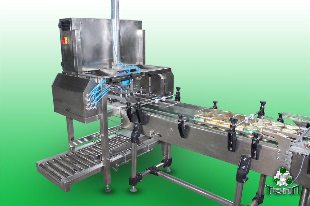 Упаковочный автомат. Представляет собой узел для укладки банок в коробку. Конструктивно он состоит из рамы, основного опускающего узла (пневматический цилиндр), плиты с вакуумными присосками, раздвигающего стола, приспособления для фиксации коробки.