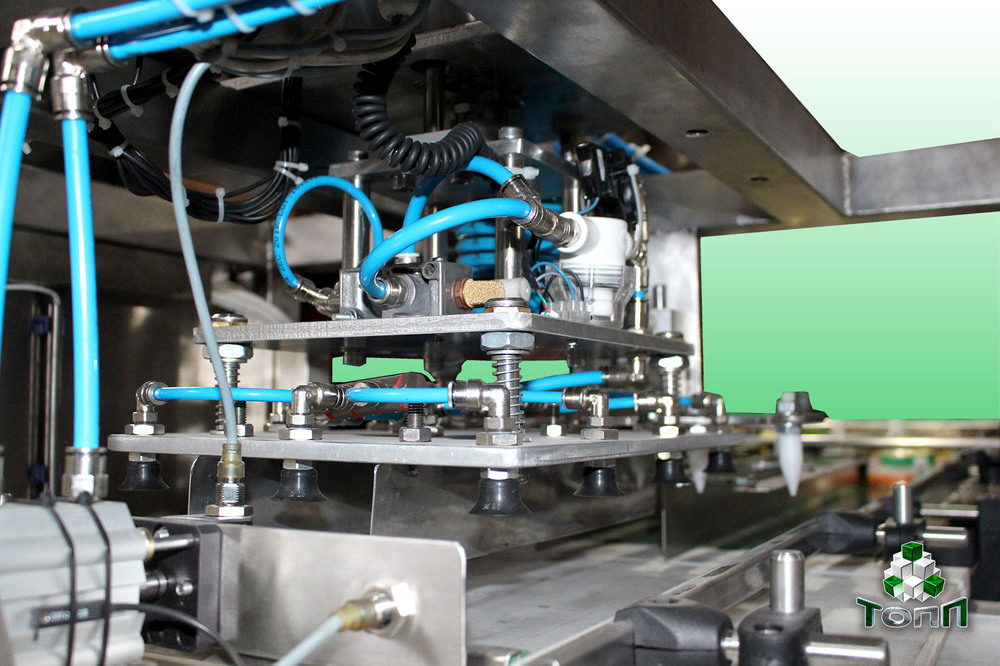 Возможен переход на банки другого диаметра. Для этого плита для крепления присосок меняется на другую, упоры и направляющие транспортеров сдвигаются на размер соответствующей банки. Причем фиксирование и отпускание настраиваемых элементов конструктивно максимально упрощены для того, чтобы наладчик средней квалификации справился с этим заданием.