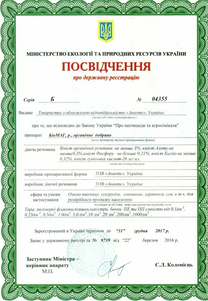 БіоМАГ - органічне, екологічно безпечне інтегроване добриво і регулятор росту нового покоління на основі сапропелю і фітогормонів, який є біологічно активною речовиною з набором макро- і мікроелементів, гумінових і фульво кислот, які роблять благотворний вплив на загальний розвиток рослин. БіоМАГ знаходиться в рідкійформі.