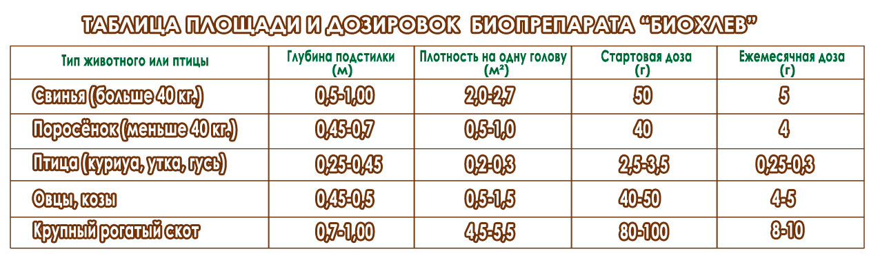 • Толщина слоя отличается по видам животных и птицы, от 45 см до 1 м.