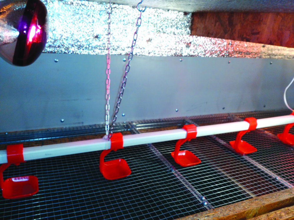 В брудере стоит ниппельная поилка на 6 поилок и ИК лампы для
