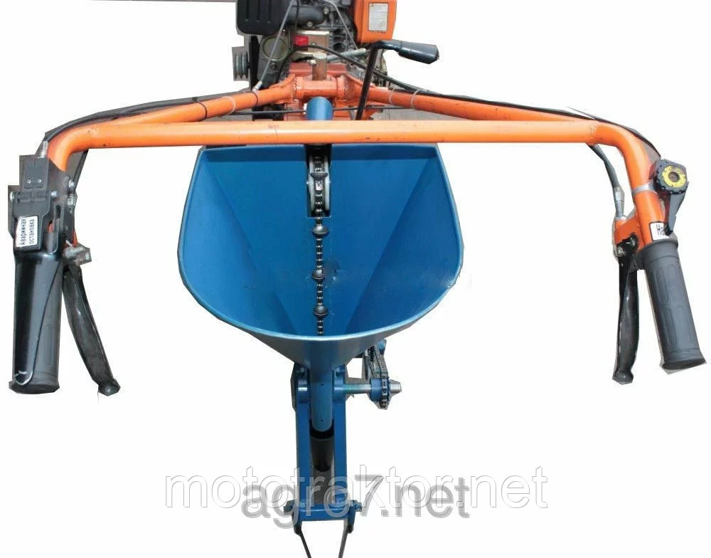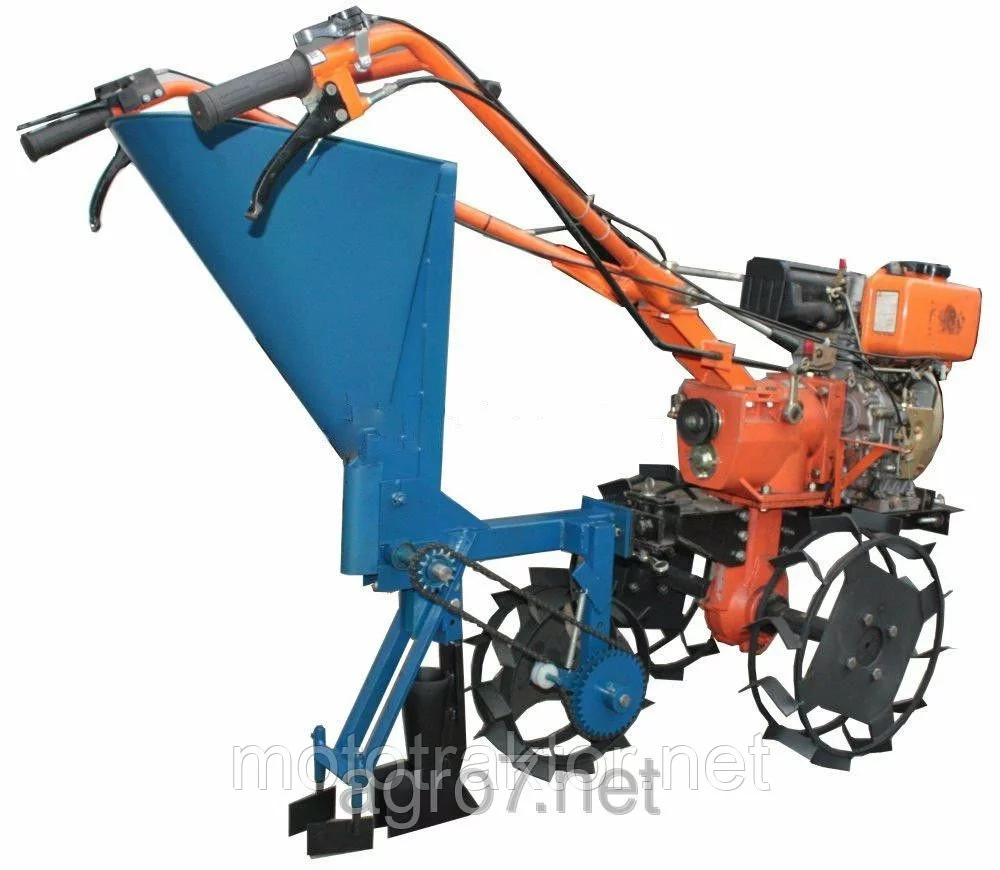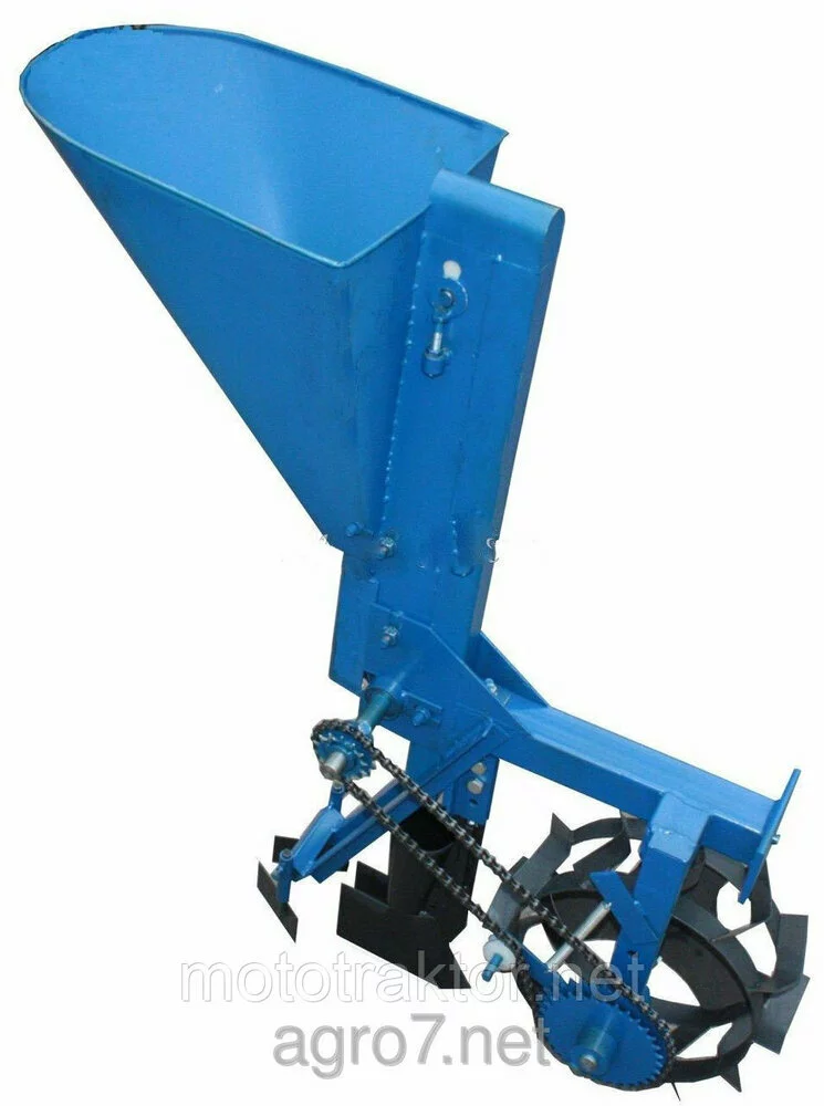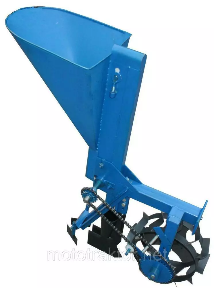 Бункер объемом 10 литров позволяет загружать достаточное количество посадочного материала для длительной работы без частых остановок. Привод механизма дозировки осуществляется от опорно-приводного колеса, благодаря чему скорость движения агрегата автоматически синхронизируется с подачей зубков в грунт. Это гарантирует точный шаг посадки и равномерное расположение строк по всему участку.
