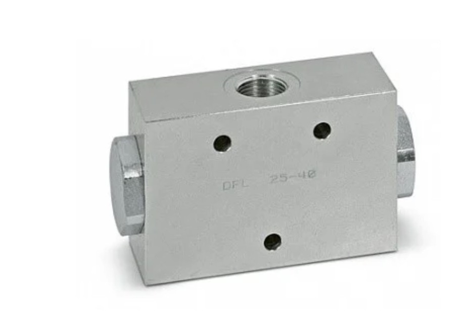 Делитель, позволяет разделить поступающую жидкость на две равные части (50/50), в то время как в противоположном направлении они объединяются независимо от изменения давления, создаваемого приводами, и их расхода. Он используется, когда должны одновременно входить и выходить два одинаковых исполнительных механизма, которые не имеют механической связи, приводятся в действие одним и тем же насосом и регулируются одним и тем же распределителем.
