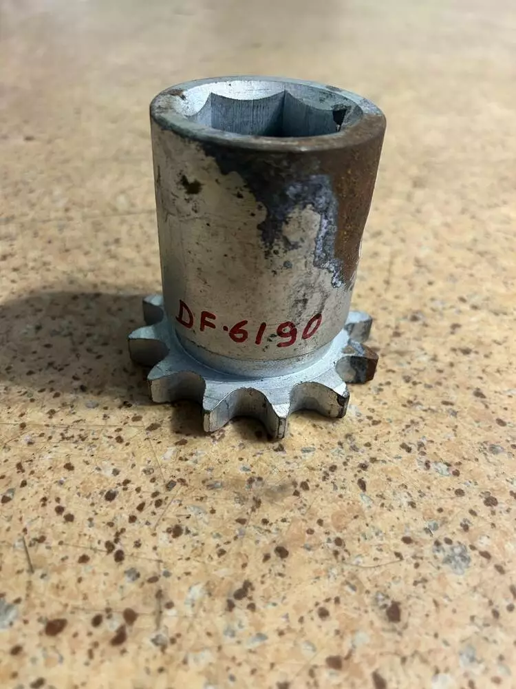 Звездочка цепной передачи привода кукурузной жатки Olimac (Drago, Drago2). Размеры мм: Внешний диаметр - 50 Шаг зубьев - 19.05 Количество зубьев - 12. Каталожные номера DF6190