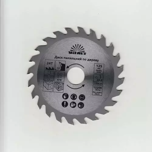 Пиляльний диск Vitals 125x22.2, ATB 24 використовується для розпилювання дерева та ДСП. Диск захищений від деформації через перегрівання завдяки використанню міцної сталі марки #50 у технології його виготовлення, а спеціальні пази по краях забезпечують ефективне охолодження диску під час виконання різання.
