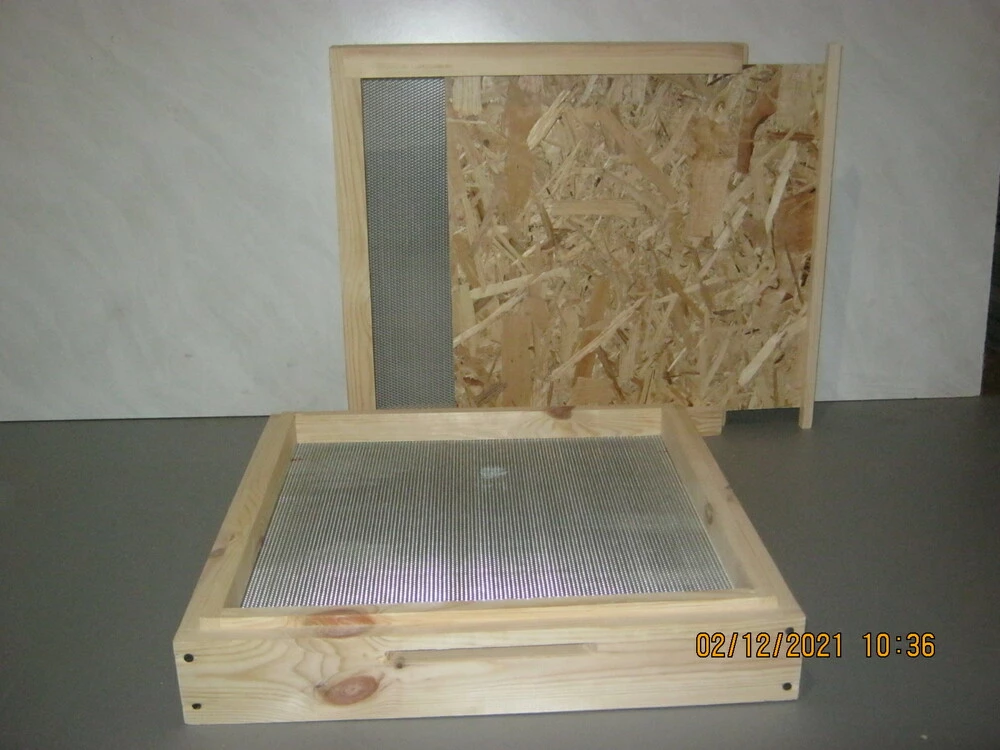 Дно сетчатое для ульев изготовлено из свежепиленой сосны прошедшей низкотемпературную камерную сушку что позволяет избежать выкипание смол и сохранить естественную структуру древесины .Толщина стенок  обвязки 35 мм. Сетка оцинкованная с сечением 2х8 мм.Выдвижной щиток изготовлен из  USB 7 мм.