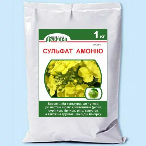Сульфат амонію – азотно-сірчане мінеральне добриво. Містить 21% азоту в амонійній формі та 24% сірки. Забезпечує значний приріст врожаю. Використовується під усі сільськогосподарські культури (від картоплі до цитрусових). Застосовується для основного удобрення ґрунтів, які мають високий ступінь насичення основами (чорноземи, сіроземи, каштанові), на дерново-підзолистих ґрунтах тільки після вапнування.