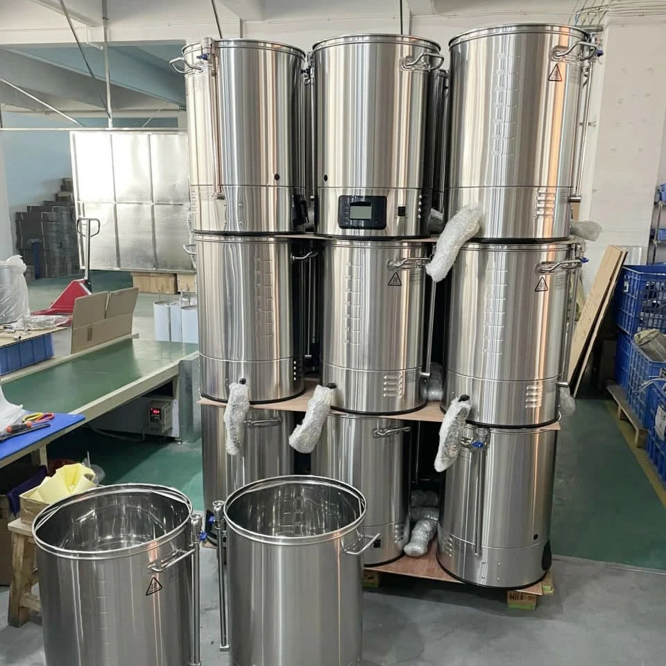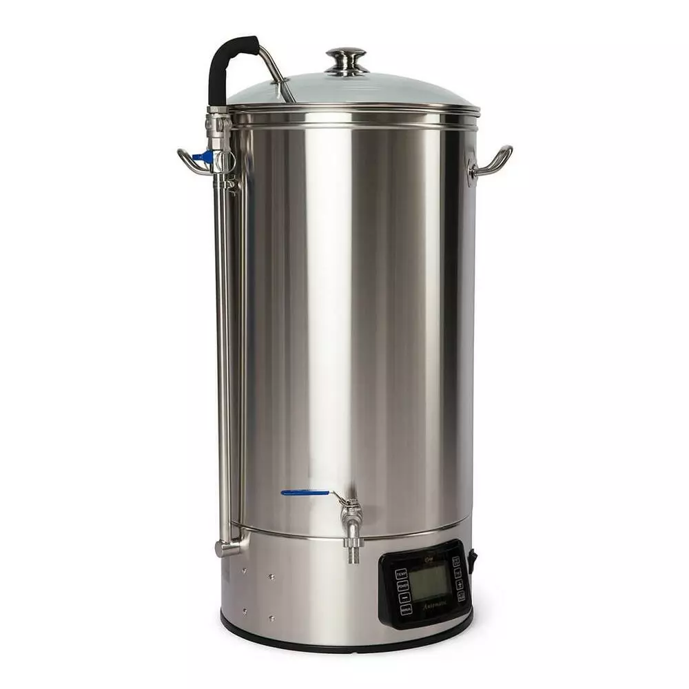Пивоварня домашняя электрическая DM-N40 з чиллером делает процесс пивоварения проще и удобнее. Всё благодаря встроенному нагревателю, электронному термостату, таймеру, насосу для циркуляции сусла и корзине для солода. Сусловарня подключается к центральному водо и электроснабжению. Благодаря обновленному автоматическому контроллеру пивоварня сама контролирует процесс варки пива. Кроме того, нет необходимости переливать сусло в промежуточные ёмкости и мыть оборудование во время варки. Корзина для солода с трубкой для перелива сусла служит для промывки дробины и фильтрации без использования дополнительной ёмкости. Погружной охладитель сусла служит для охлаждения сусла до температуры внесения дрожжей. Дисковый нагреватель регулируемая мощность нагрева. Цифровой контроллер с дисплеем для каждой паузы можно задать температуру,  время и мощность. Фильтр "Базука" предохраняет насос от засорения. Служит для фильтрации сусла от крупных частиц при сливе через краник. Система циркуляции способствует равномерному распределению температуры по всему объёму затора. Предотвращает локальный перегрев на дне