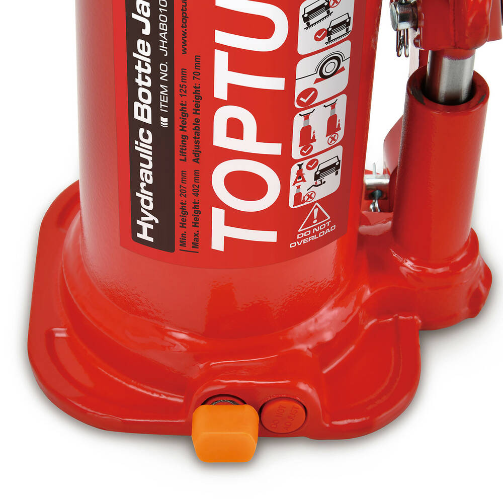 TOPTUL JHAB0102 — это надежный гидравлический бутылочный домкрат, предназначенный для безопасного подъема автомобилей при ремонте и техническом обслуживании. Отличается высокой прочностью, удобством использования и повышенным уровнем безопасности.
