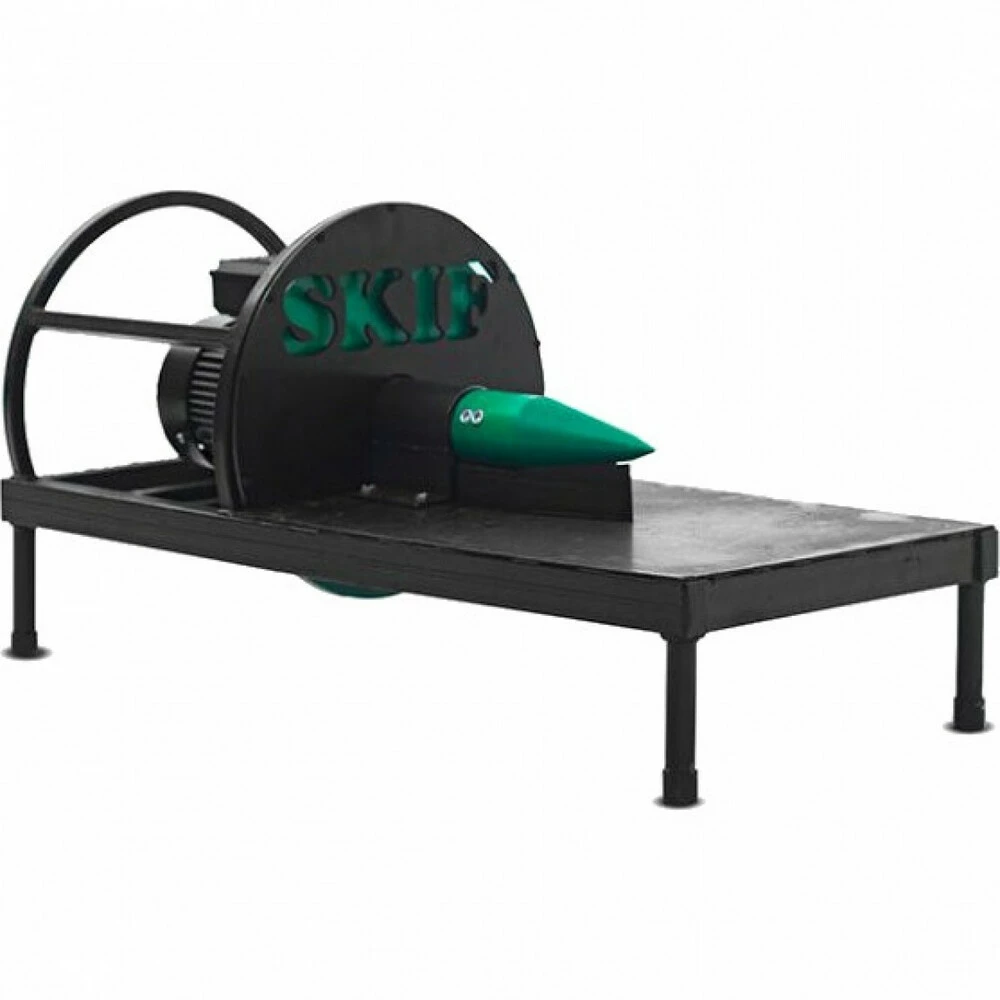 Агрегат выполнен на металлической раме. Сердцем служит электрический двигатель с мощностью в 3000 Вт. Он подключается к однофазной сети, поэтому использовать инструмент будет очень просто в домашних условиях. Принудительное охлаждение оберегает обмотки от выхода из строя. Дополнительно для рассеивания излишка тепла предусмотрены ребра на корпусе. Максимальное значение развиваемых оборотов — 3000 в минуту. Этого вполне достаточно для планируемых задач.