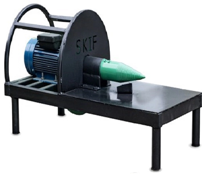 Подача поленьев происходит очень просто. Для этого достаточно положить их на небольшую станину. Благодаря форме витков,конус легко проникает внутрь дерева и одновременно расслаивает его на части. Никаких разлетающихся щепок . Все безопасно и легко. Мотор также защищен от механических повреждений специальными усиливающими дугами.