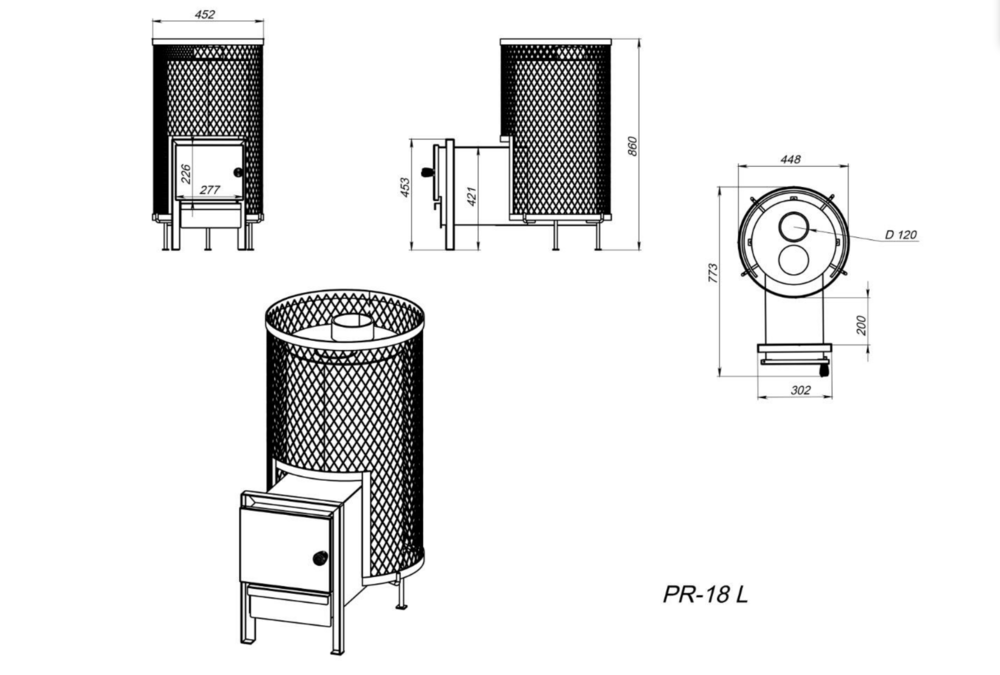 PR-18 L – печь для бани до 18 кубических метров. Благодаря выносу дверцы топки в предбанник – гораздо удобнее забрасывать поленья в топку, не заходя в саму парилку и соответственно, не занося туда мусор и мелкие щепки. Наличие специальной сетки позволяет загрузить в каменку до 80 кг камней, которые после затухания огня еще долго будут отдавать тепло в парное помещение. Печь комплектуется стальной дверцей.
