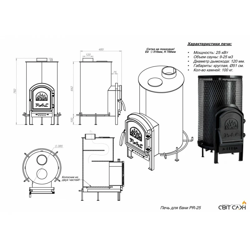 PR-25 – это печь для бани PAL средних размеров, рассчитанная на парные вплоть до 25 кубических метров. Наличие специальной сетки позволяет загрузить в печь до 100 кг камней, которые даже после затухания огня еще долгое время могут отапливать парную. Чугунная дверца обработана термостойкой краской черного цвета, которая выдерживает перепады температур и не облупливается даже после долгой эксплуатации.