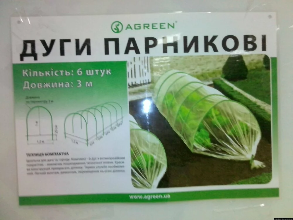 В комплект входят: дуги металлические с антикоррозийным полимерным покрытием - 6шт (ширина -1.2 м, высота-1.0 м). Воткнув дуги в грунт через 80 см вы получите аккуратную тепличку длиной 4.0 м.