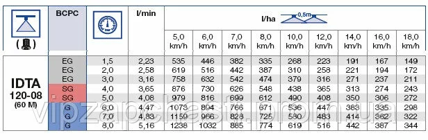 Нормы расхода распылителя IDTA Lechler:
