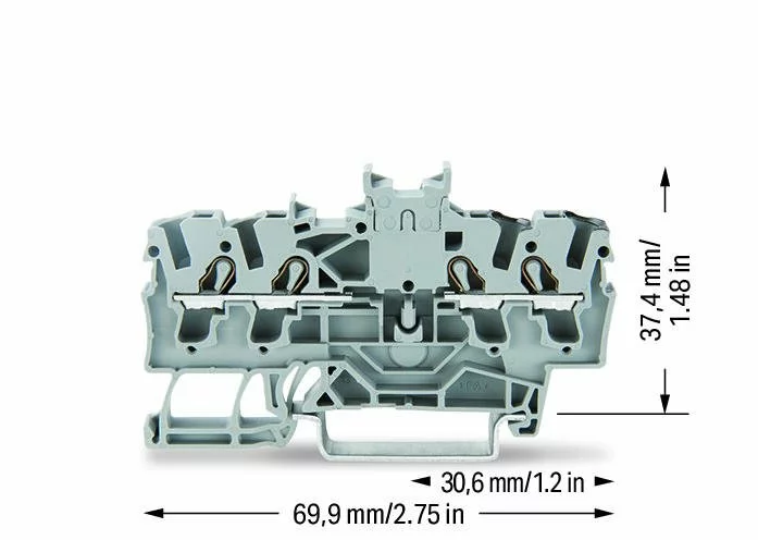 Двухпотенциальные клеммы 2,5 мм² Wago 2002-1441, с двойным центральным маркировочным разъемом; для DIN-рейки 35 x 15 и 35 x 7,5; Push-in CAGE CLAMP®; 2,50 mm²; серые.