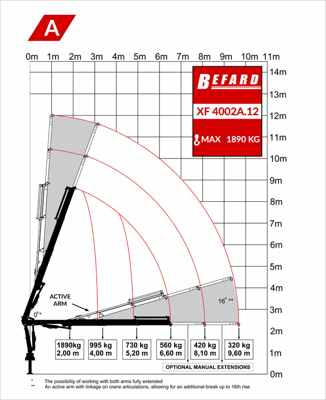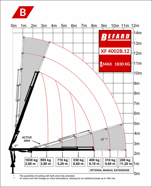 BEFARD XF — это серия кранов-манипуляторов с двойной стрелой, предназначенных для установки на легкие грузовики, такие как: Iveco 50c15, Renault Mascot, а также на более мелкие грузовые автомобили, такие как Mercedes Atego, Iveco Eurocargo и другие. В зависимости от конкретной конфигурации краны BEFARD XF могут быть оснащены одним, двумя, тремя или даже четырьмя гидравлическими удлинителями. Увеличенное количество удлинителей позволяет машине работать на больших расстояниях.