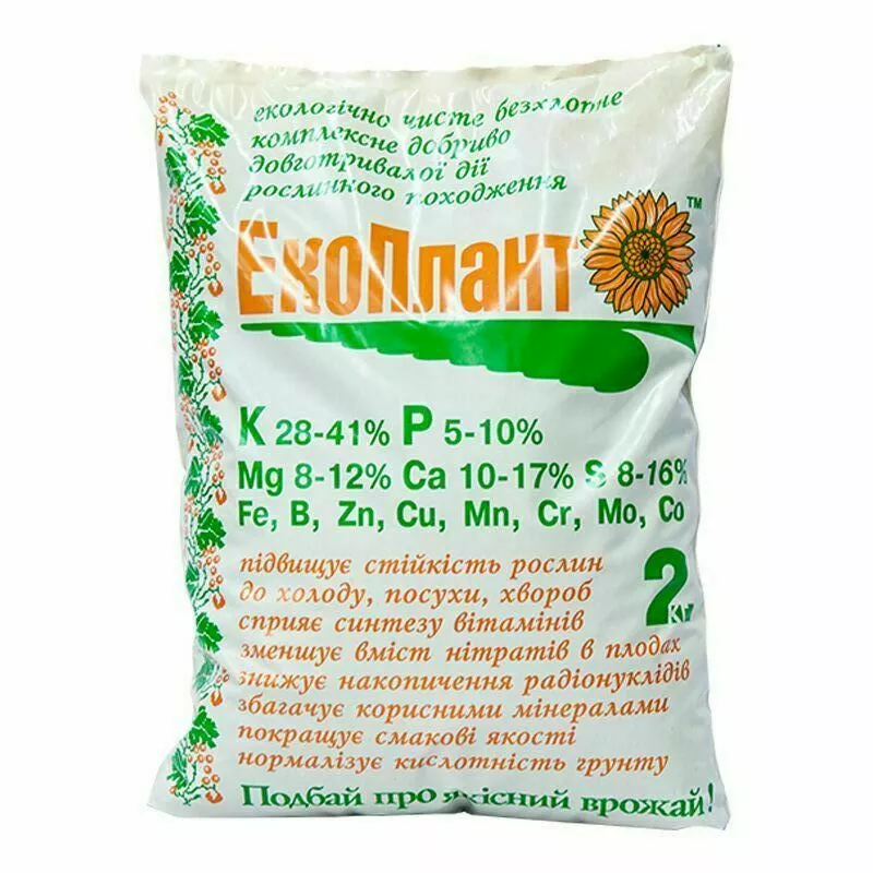 Основою добрива Екоплант є макро- (калій, фосфор, магній, кальцій, сірка) та мікроелементи.