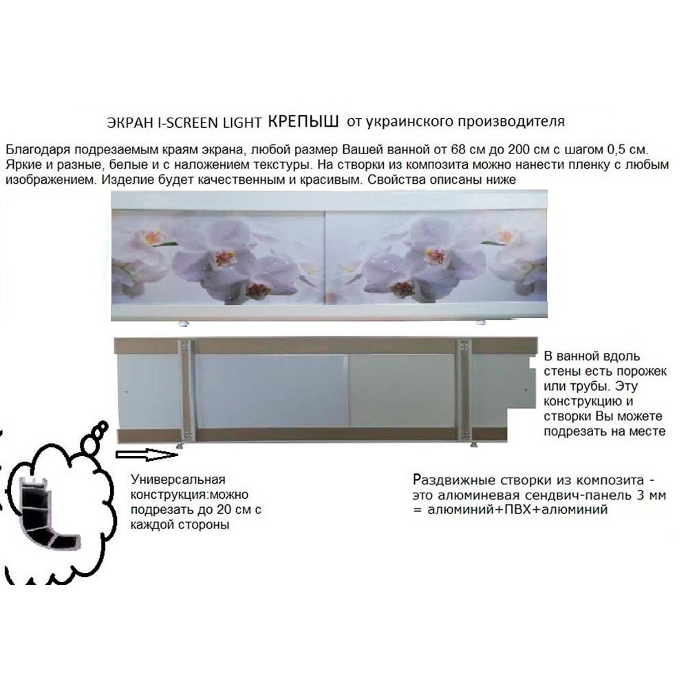 Ширина экрана 130 см. Высота экрана составляет 50 см + 2 см ножки. При необходимости добавляем удлинители. Регулировочная высота от 52 см до 60 см. В этой серии экране можно сделать вырез под порожки и трубы вдоль стен самостоятельно. При этом не нарушая целостности и функций конструкции.Раздвижные створки экрана под ванну изготовлены из композитной сендвич-панели. Они плотные, крепкие, влагостойкие. Пленка с изображением будет радовать Вас и поднимать настроение при каждом взгляде. Ведь понравившийся цвет или оттенок приносит эмоциональное удовольствие. По возникшим вопросам обязательно обращайтесь " Задать вопрос о товаре". Мы с радостью ответим на всё что Вас интересует в нашем магазине.