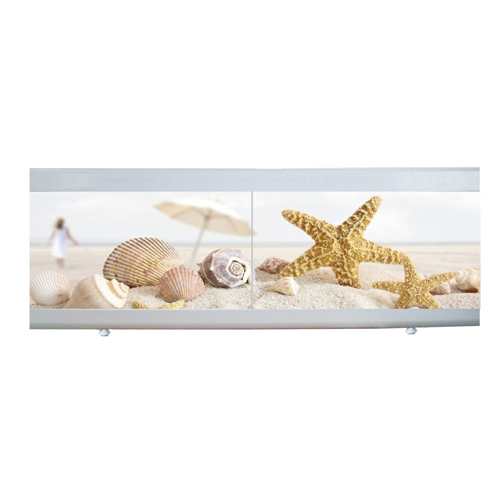 Экран изготовлен из влагостойких материалов, то что нужно для ванной комнаты.Ширина экрана 140 см. Высота экрана составляет 50 см + 2 см ножки + до 3х см регулирующие. При необходимости добавляем удлинители. Установочная высота увеличивается до 60 см за счет откручивания и удлинение ножек. Мы используем качественные материалы, которые в свою очередь имеют хорошую износостойкость, влагостойкость и гибкость. За счет этого в этом экране можно сделать вырез под порожки и трубы (вдоль стен) самостоятельно. При этом сохраняя целостность и функциональность конструкции.Экран скроет ужасное темное пространство под ванной, так что Вы сможете еще и использовать это место с пользой. Спрячьте за экраном бытовую химию, и посмотрите сколько места у Вас освободилось в шкафу? Целая полка, а может и две!Раздвижные дверки экрана под ванну изготовлены из вспененного ПВХ с нанесением пленки  и фотопечати. Они - влагостойкие, а значит подходят для ванной, место всегда с повышенной влажностью. Пленка с изображением будет радовать Вас и поднимать настроение при каждом взгляде. Ведь понравившийся цвет или оттенок приносит эмоциональное удовольствие.Какой замечательный и приятный рисунок на раздвижных дверках. Нежное голубое небо и песчаный пляж, ракушки, морские звезды, приятный солнечный день согреет даже в лютую зиму. И это все находится у Вас, в вашей ванной комнате. Действительно, приятные впечатления, а возможно и воспоминания есть ...В нашем магазине можно купить с таким же изображением и тумбу.Возникли вопросы, напишите "Задать вопрос о товаре". Мы с радостью ответим на все что Вас интересует в нашем магазине.