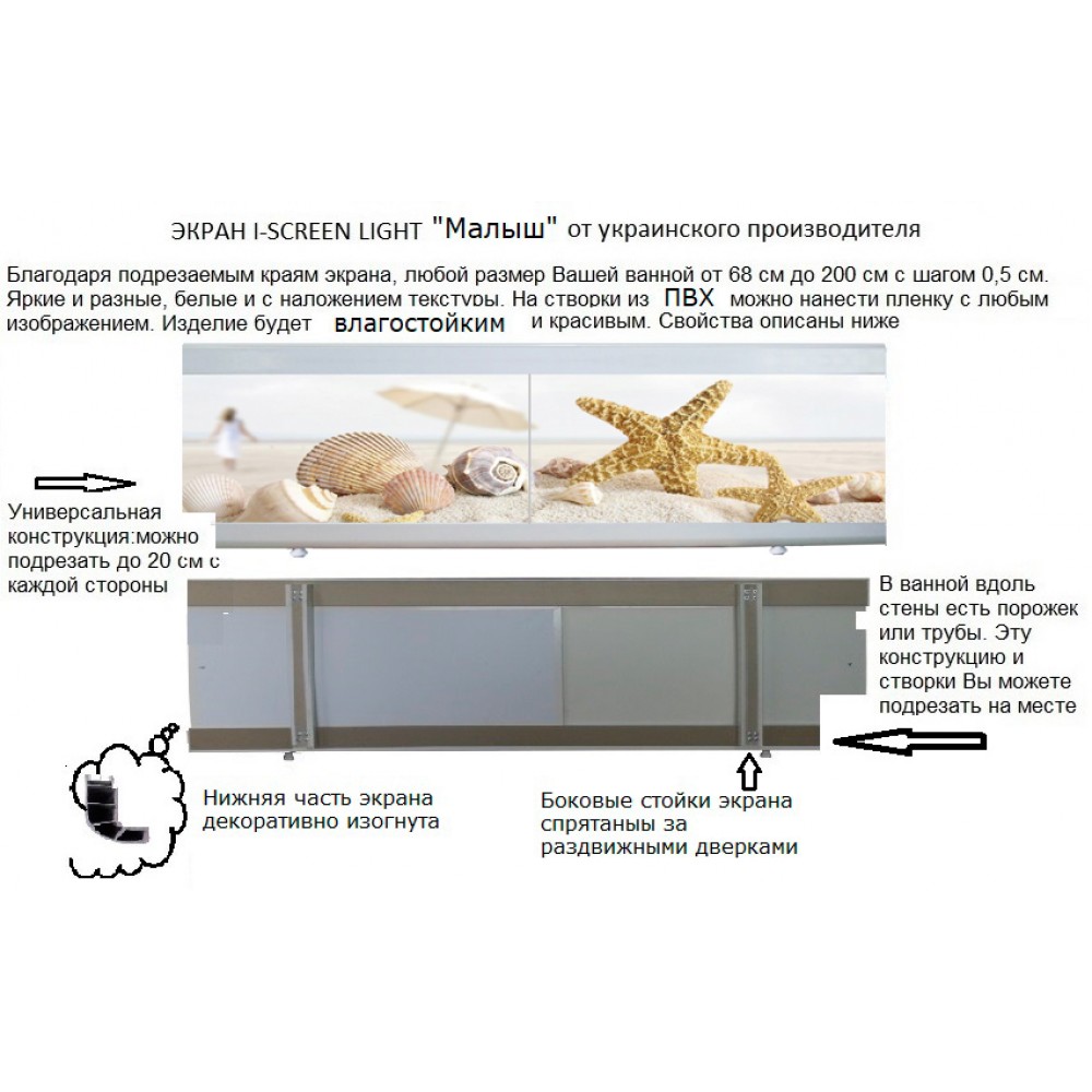Экран изготовлен из влагостойких материалов, то что нужно для ванной комнаты.Ширина экрана 190 см. Высота экрана составляет 50 см + 2 см ножки + до 3х см регулирующие. При необходимости добавляем удлинители. Установочная высота увеличивается до 60 см за счет откручивания и удлинение ножек. Мы используем качественные материалы, которые в свою очередь имеют хорошую износостойкость, влагостойкость и гибкость. За счет этого в этом экране можно сделать вырез под порожки и трубы (вдоль стен) самостоятельно. При этом сохраняя целостность и функциональность конструкции.Экран скроет ужасное темное пространство под ванной, так что Вы сможете еще и использовать это место с пользой. Спрячьте за экраном бытовую химию, и посмотрите сколько места у Вас освободилось в шкафу? Целая полка, а может и две!Раздвижные дверки экрана под ванну изготовлены из вспененного ПВХ с нанесением пленки  и фотопечати. Они - влагостойкие, а значит подходят для ванной, место всегда с повышенной влажностью. Пленка с изображением будет радовать Вас и поднимать настроение при каждом взгляде. Ведь понравившийся цвет или оттенок приносит эмоциональное удовольствие.Какой замечательный и приятный рисунок на раздвижных дверках. Нежное голубое небо и песчаный пляж, ракушки, морские звезды, приятный солнечный день согреет даже в лютую зиму. И это все находится у Вас, в вашей ванной комнате. Действительно, приятные впечатления, а возможно и воспоминания есть ...В нашем магазине можно купить с таким же изображением и тумбу.Возникли вопросы, напишите "Задать вопрос о товаре". Мы с радостью ответим на все что Вас интересует в нашем магазине.
