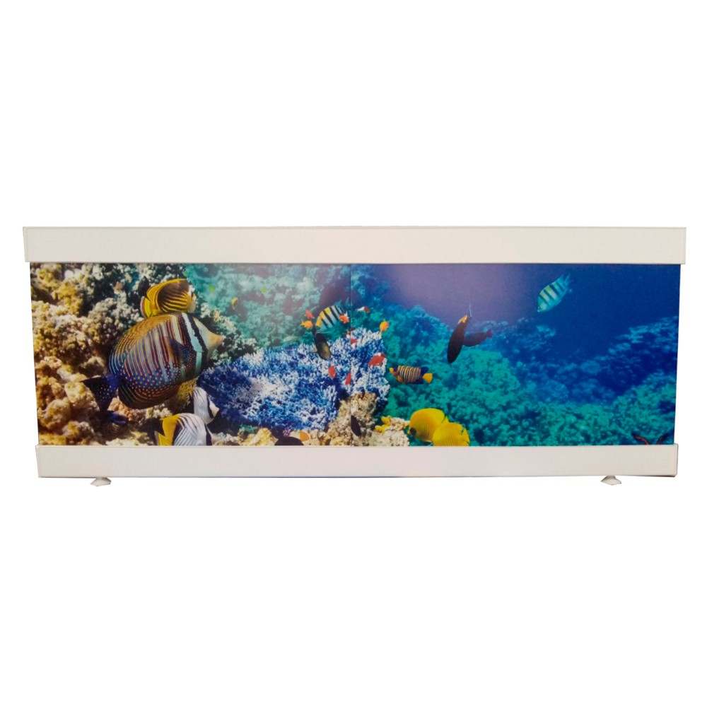 Экран под ванну служит нескольким функциям, одна из них это закрытие пространства под ванной, а так же декоративное оформление ванной комнаты. Корпус экрана выполнен из пластика толщиной 2 см, раздвижные шторки могут быть из вспененного ПВХ или композита (алюминиевый  пластик ) толщиной 3 мм. Корпус данного экрана разработан специально для уменьшения его ширины на 25 см с каждой стороны, что позволяет его самостоятельно подогнать под ваши индивидуальные размеры. Картинки могут быть любые из нашего сайта или же можем совместно с вами подобрать индивидуально вашу картинку под дизайн вашей ванной.
