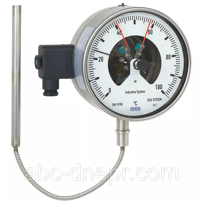 Электроконтакты (электрические сигнальные контакты) замыкают или размыкают цепи в зависимости от положения стрелки измерительного прибора. Переключающие контакты регулируются в пределах всего диапазона измерения. Электроконтактный термометр имеет стрелку (стрелка текущих значений), которая свободно перемещается в пределах полной шкалы, независимо от величины уставки. Положение контрольной стрелки может регулироваться через стекло с помощью съемного регулировочного ключа (смонтированного на клеммном блоке). Электроконтакты с несколькими группами могут иметь одну и ту же уставку. Срабатывание контактов происходит при переходе стрелки значения уставки.