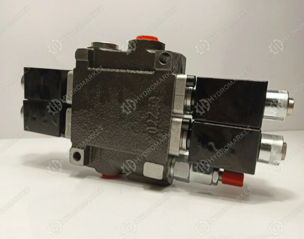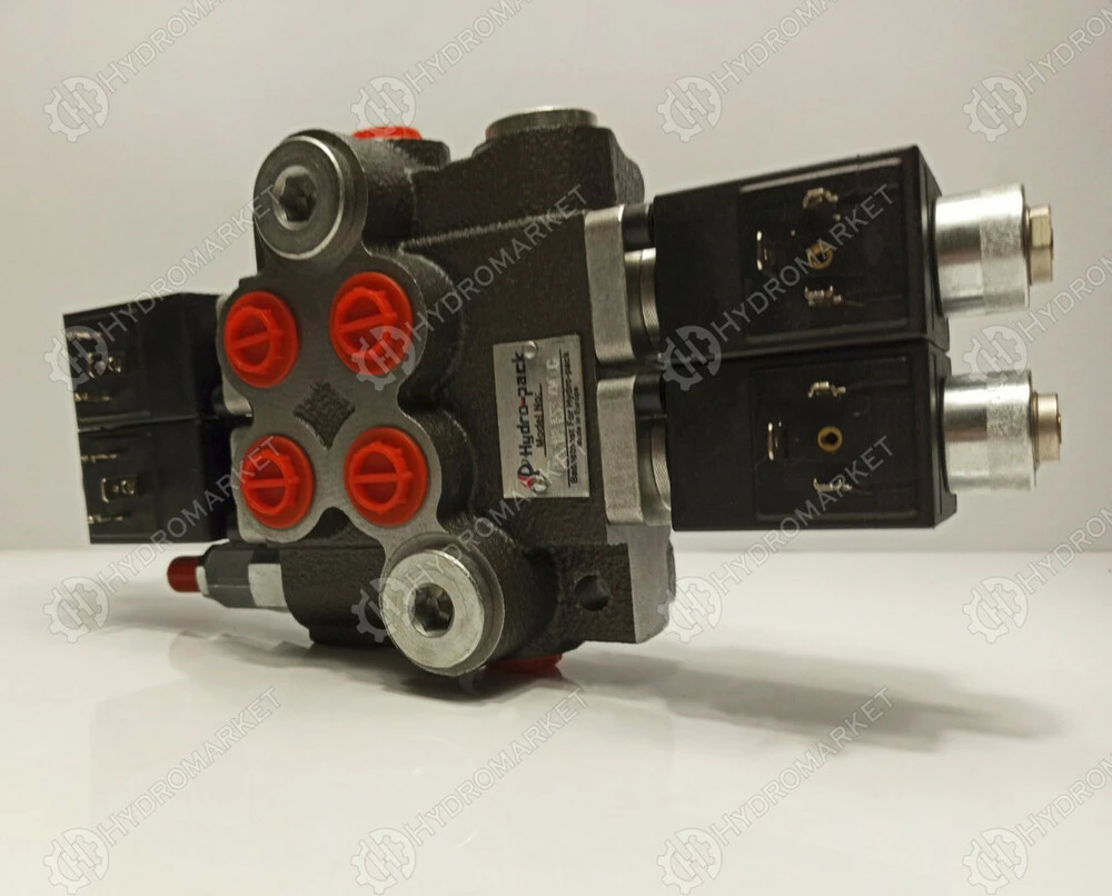 Если на катушку распределителя не подавать ток, то масло с подачи идет на слив и так циркулирует. Если дать ток на катушку, масло по рабочей линии пойдет в гидроцилиндр. Устройство может управлять гидроцилиндрами одностороннего и двустороннего действия. Устройство имеет предохранительный клапан который выставлен на 175Bar.