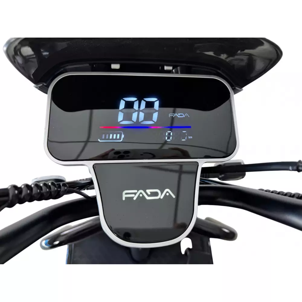 Основной технической особенностью трайка FADA является более мощный электродвигатель на 1000 Ватт. Батарейный модуль на 72 вольт состоит из 6 ведущих АКБ, каждая из батарей теперь по 25 А/ч.