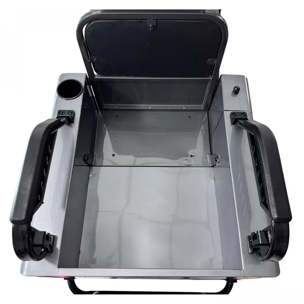 Расширенный стандартный пакет опций Складное заднее сиденье + багажная корзина спереди Самый мощный двигатель 1000 Ватт Полноценный двухместный вариант + раскладывается заднее сиденье Легкосплавные диски и бескамерные шины размерности 3.00-10