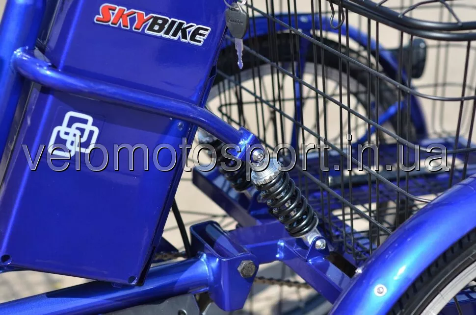 Электровелосипед SKYBIKE 3-CYCL (350W-36V) - имеет большой функционал, благодаря наличию вместительной задней грузовой корзины в дополнение к обычной для большинства электрических велосипедов передней корзине. Также неоспоримый плюс — это три колеса вместо обычных двух. Электровелосипед SKYBIKE 3-CYCL отлично подойдет для людей зрелого возраста и молодых родителей не только для прогулок на природе или по городу, но и послужит Вам как достаточно вместительное транспортное средство.Мягкая удобная сидушка, больше, чем в обычном велосипеде, низкая посадка, пара задних аммортизаторов, натяжитель цепи, отличная устойчивость, лёгкая управляемость и пара вместительных корзин для покупок.