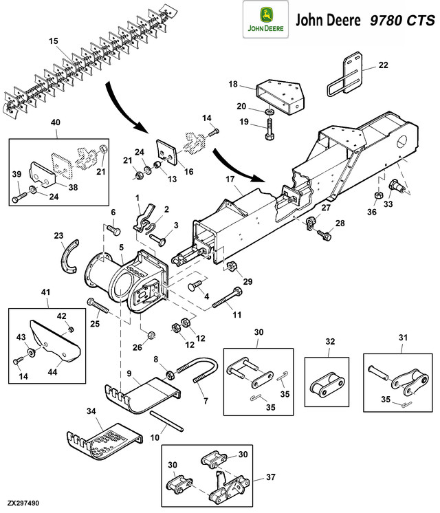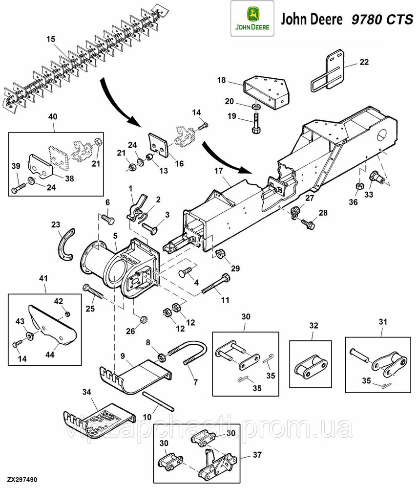 AZ101808​ цепь элеватора зернового John Deere, AH162058 применяется к 9680 CTS,W650, W660, C670 (Транспортер элеватора зернового (140 звеньев, 33 скребка, t=41.4) (AH162058/AZ63315), JD9640-9680WTS)