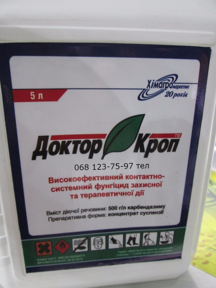 Системный фунгицид с защитным и лечебным действием, для опрыскивания вегетирующих растений и протравливания семян. Культуры: пшеница яровая, пшеница озимая, ячмень яровой, ячмень озимый, рожь озимая, рапс,сахарная свекла и кормовая свекла. Действующее вещество :карбендазим, 500 г/л. Препаративная форма- концентрат суспензии. Пластиковая канистра 5 литров Действующее вещество препарата карбендазим , благодаря своим системным возможностям активно защищает культуры от комплекса заболеваний. Использование фунгицида повышает выносливость культурных растений и обеспечивает получения высоких урожаев. Норма расхода : 0,4-0,5 л/га пшеница, ячмень, рожь, рапс 0,6 л/га Преимущества препарата: · Препарат имеет профилактические и лечебные свойства; · Отменный контроль большинства грибных заболеваний; · Применение фунгицида повышает выносливость растения и обеспечивает получение высоких урожаев. Механизм действия: Препарат Хилтон, Доктор Кроп к.с. используется в качестве фунгицида для обработки вегетирующих растений и для протравливания семян. Действующее вещество препарата карбендазим благодаря своим системным свойствам активно защищает растение от комплекса болезней. Карбендазим нарушает метаболизм патогенных грибов через деактивацию фермента бета-тубулина. Фунгицид Доктор Кроп -карбендазим, 500/л - упаковка канистра 5 литров.