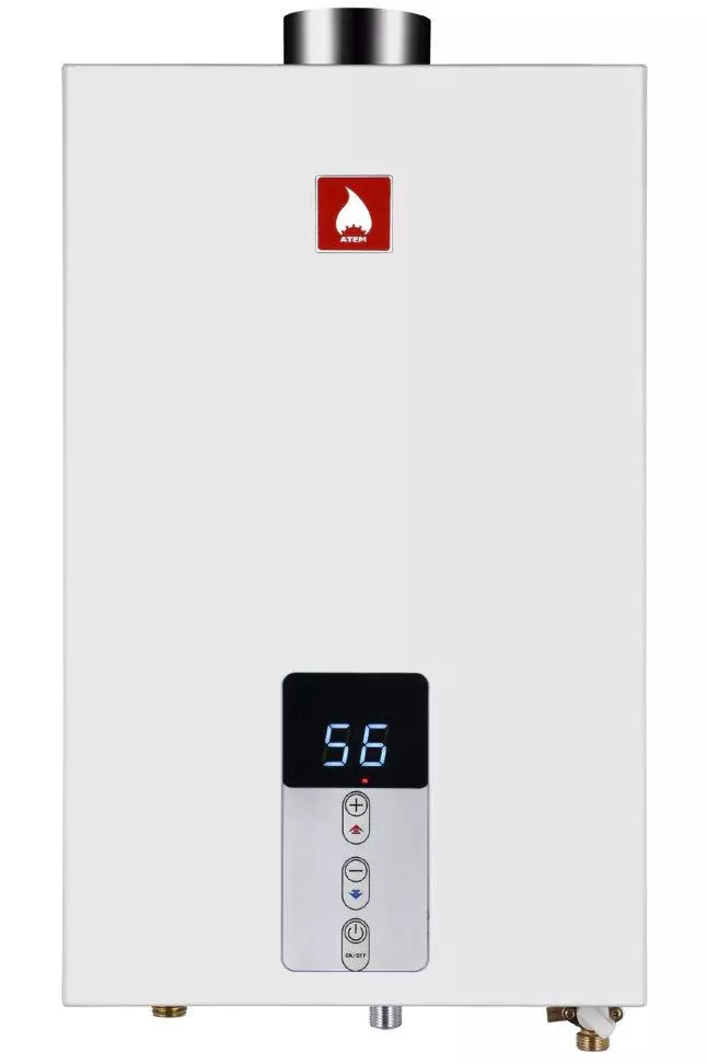 АТЕМ ВПГ-20Т ТУРБО - газовий проточний водонагрівач з примусовим відводом продуктів згоряння, турбований водонагрівач для підігріву води продуктивністю до 9,4 л/хвилину. В турбированній газовій колонці Атем використана закрита камера згоряння - повітря через коаксіальну трубу для горіння надходить із зовні приміщення і відпрацьовані гази виходять назовні. На передній панелі турбо водонагрівача розташовані кнопки збільшення і зменшення температури та дисплей для відображення поточної температури горячої води.
