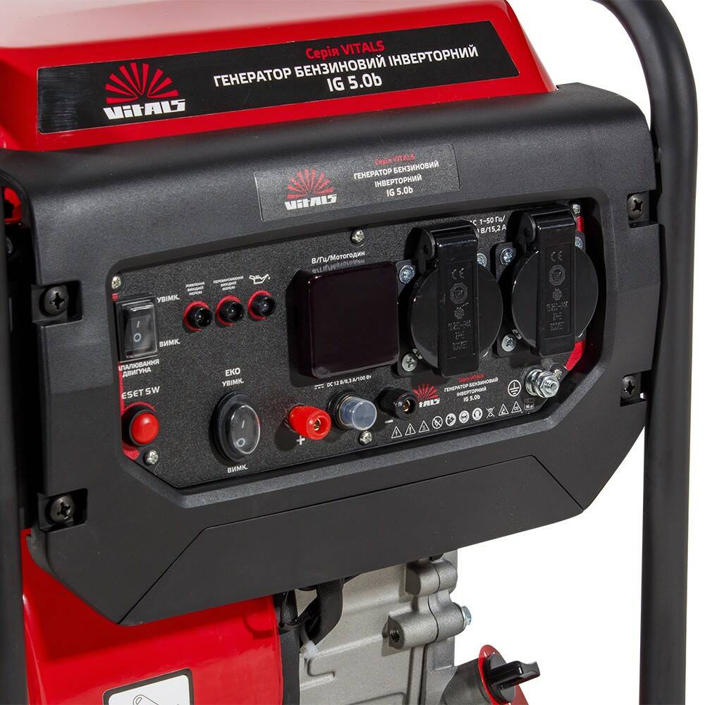 Особливості Номінальна витрата палива - 394 г/кВт*година; Коефіцієнт потужності (сos Ф) – 1; Розетки, 230В/16А – 2; Цифровий контролер 3в1 - Напруга/Частота струму/Мотогодинник; Порти USB, 5В/2А – ні; Режим «ЕКО» – є; Регулятор напруги – інверторний модуль; Режим паралельного підключення – ні; Паливо бензин А-92; Об'єм масла в картері - 0,6 л; Інверторний генератор Vitals IG 5.0b виробляє електроенергію з правильною синусоїдою, що робить його ідеальним для живлення чутливого електронного обладнання, такого як комп'ютери, телевізори, опалювальні котли та інші пристрої, чутливі до синусоїди струму. У генераторі Vitals IG 5.0b застосований чотиритактний бензиновий двигун із верхнім розташуванням клапанів. Інноваційна конструкція кришки стартера та крильчатки охолодження запобігає перегріву двигуна. Глушник промислового типу забезпечує посилене шумопоглинання, покращене відведення та розподіл тепла. Шум та вібрації при роботі додатково гасять демпферні опори, якими двигун кріпиться до жорсткої металев