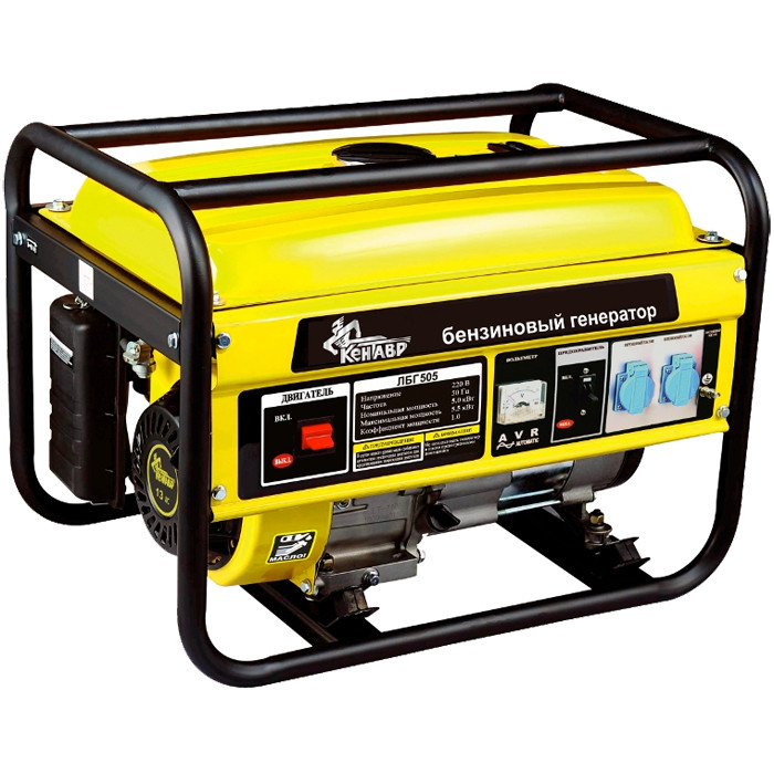 Бензиновый генератор Кентавр КБГ 505 а  агрегат с мощным двигателем и надежной  системой воздушного охлаждения.  Оборудован колесами и транспортировочной ручкой для легкого перемещения. Запускается ручным кик-стартером. Топлива хватает примерно на 16 часов непрерывной работы при максимальной нагрузке.