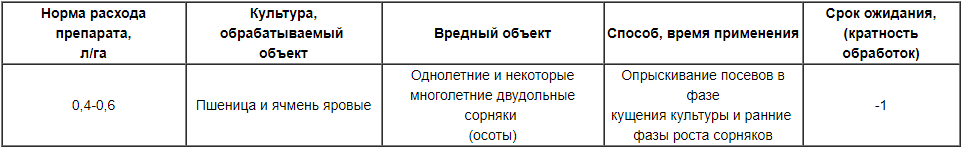 Преимущества: Действия препарат на сорняки видно уже через 12-18 часов. Активность гербицида происходит при температуре +5. Препарата не является летучим, что дает возможность минимальных потерь при использовании. Совместим с гербицидами и другими препаратами. Не снижается эффективность даже при засухе и осадках. При хранении до -20 градусов, препарат не замерзает и не кристаллизуется. Действует на широкий спектр разных видов сорняков.