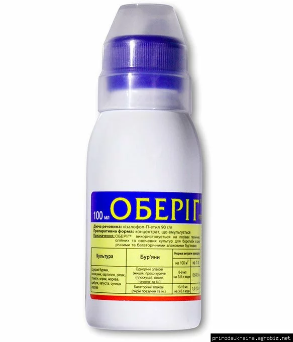 Обериг - послевсходовой гербицид предназначен для защиты с / х культур (морковь, томаты, яровой и озимый рапс, картофель, подсолнечник, сахарная свекла, огурцы, лук, капуста) от трав вредителей (ползучий пырей, просо, пшеница и ячмень (паделеця), алепское сорго, брома, пальчатка, пальчатым свинорий, мишохвостий лисохвост, мятлик, райграс, трава обычная канареечник).